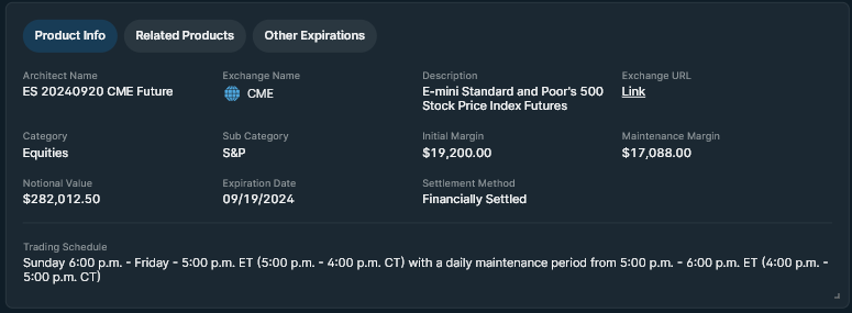 An example of the Product Info page for CME's E-Mini S&P 500 future